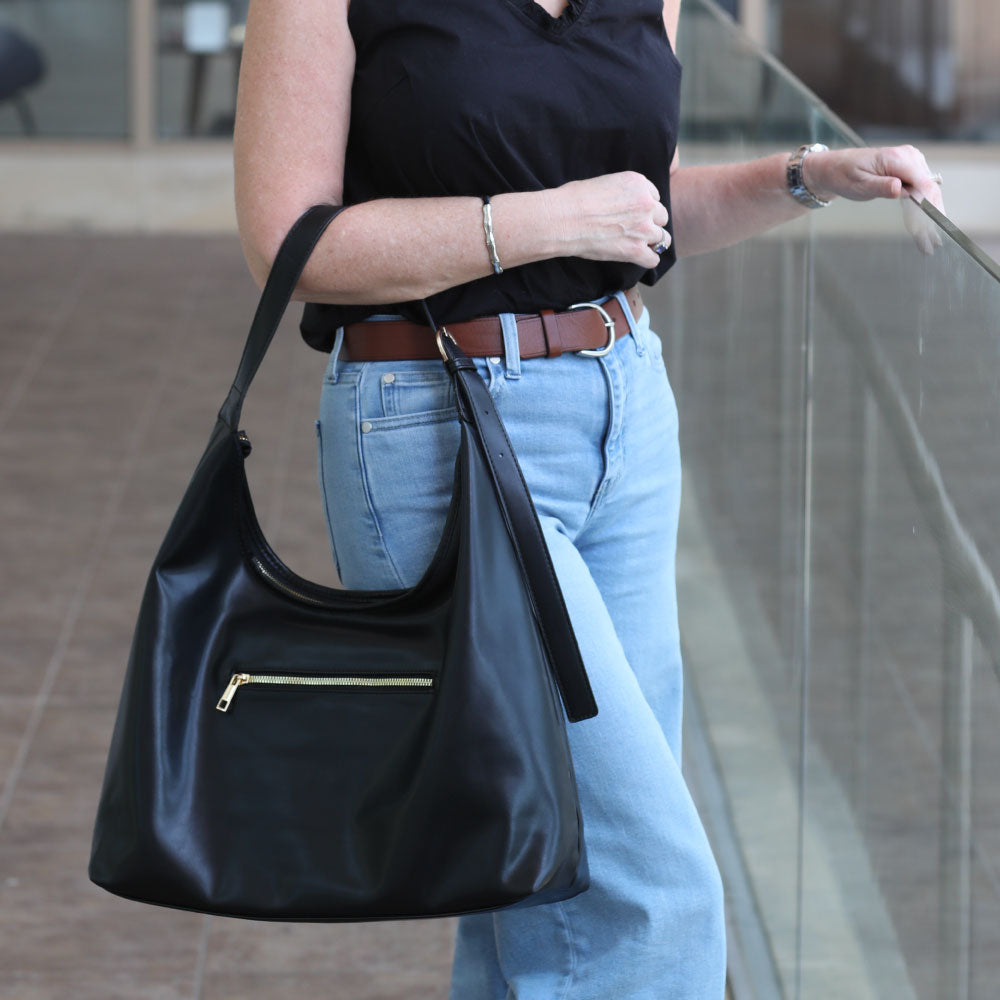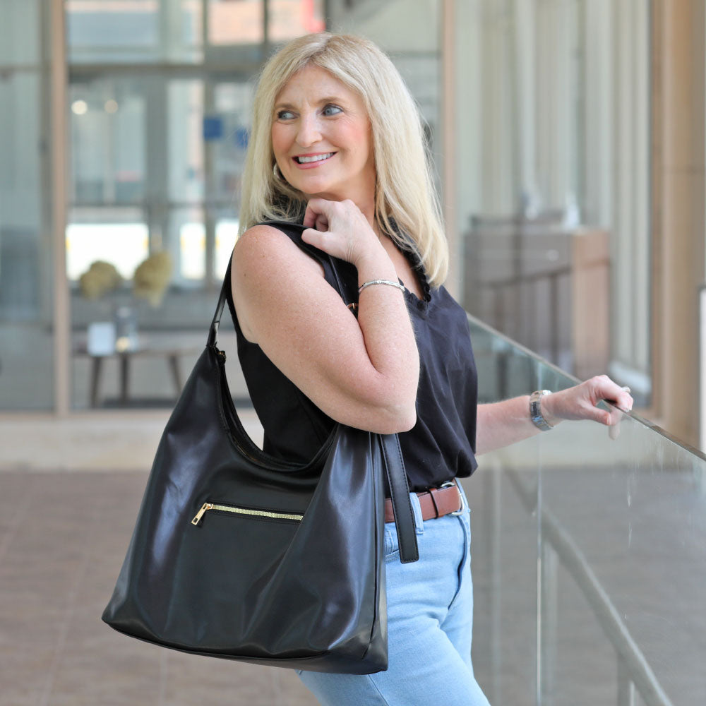 This effortlessly chic shoulder bag features a slouchy silhouette with plenty of room for your everyday essentials. Designed with an exterior zipper for quick access, an interior zipper pocket for organization, and built-in RFID card sleeves for added protection.
